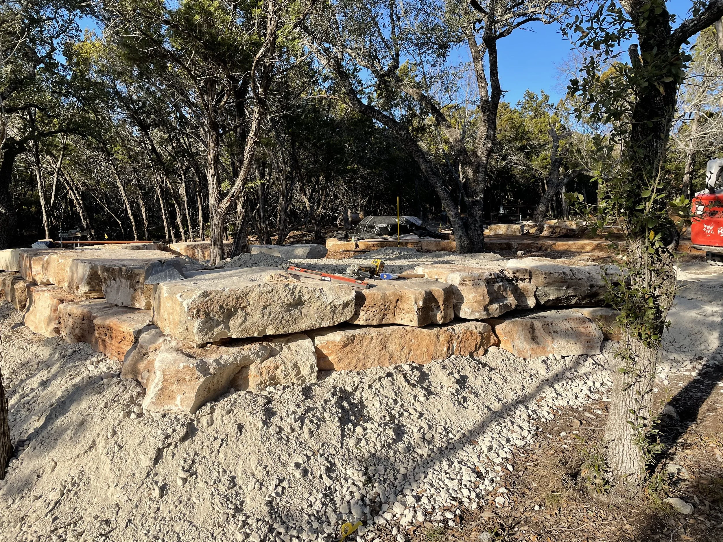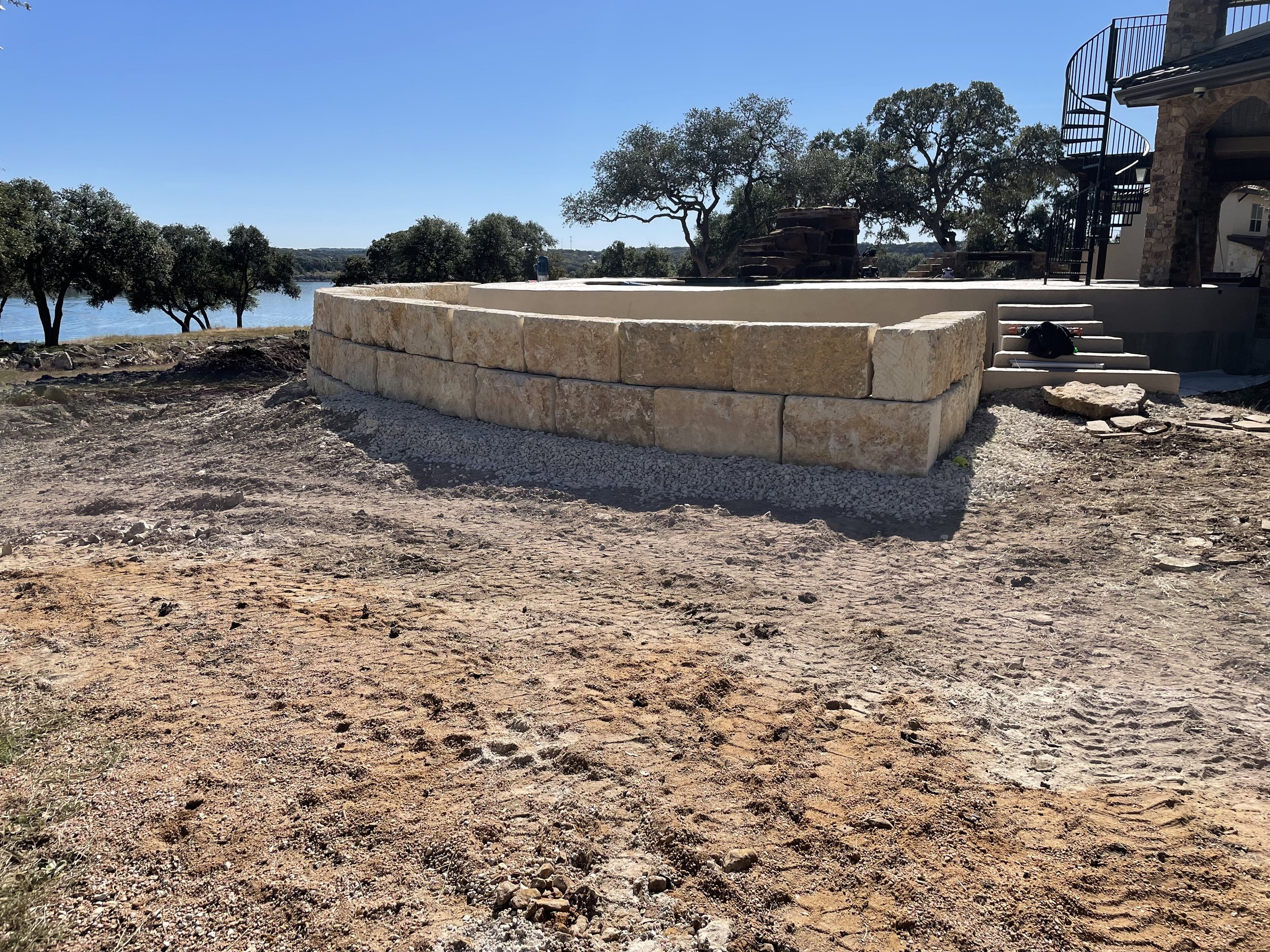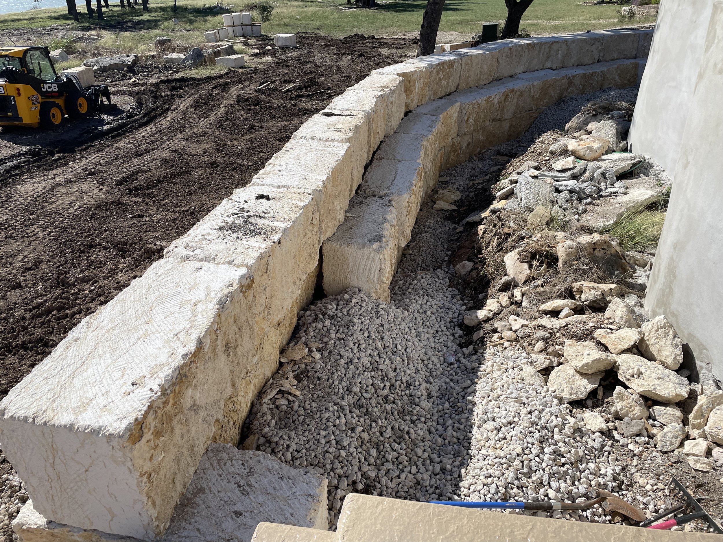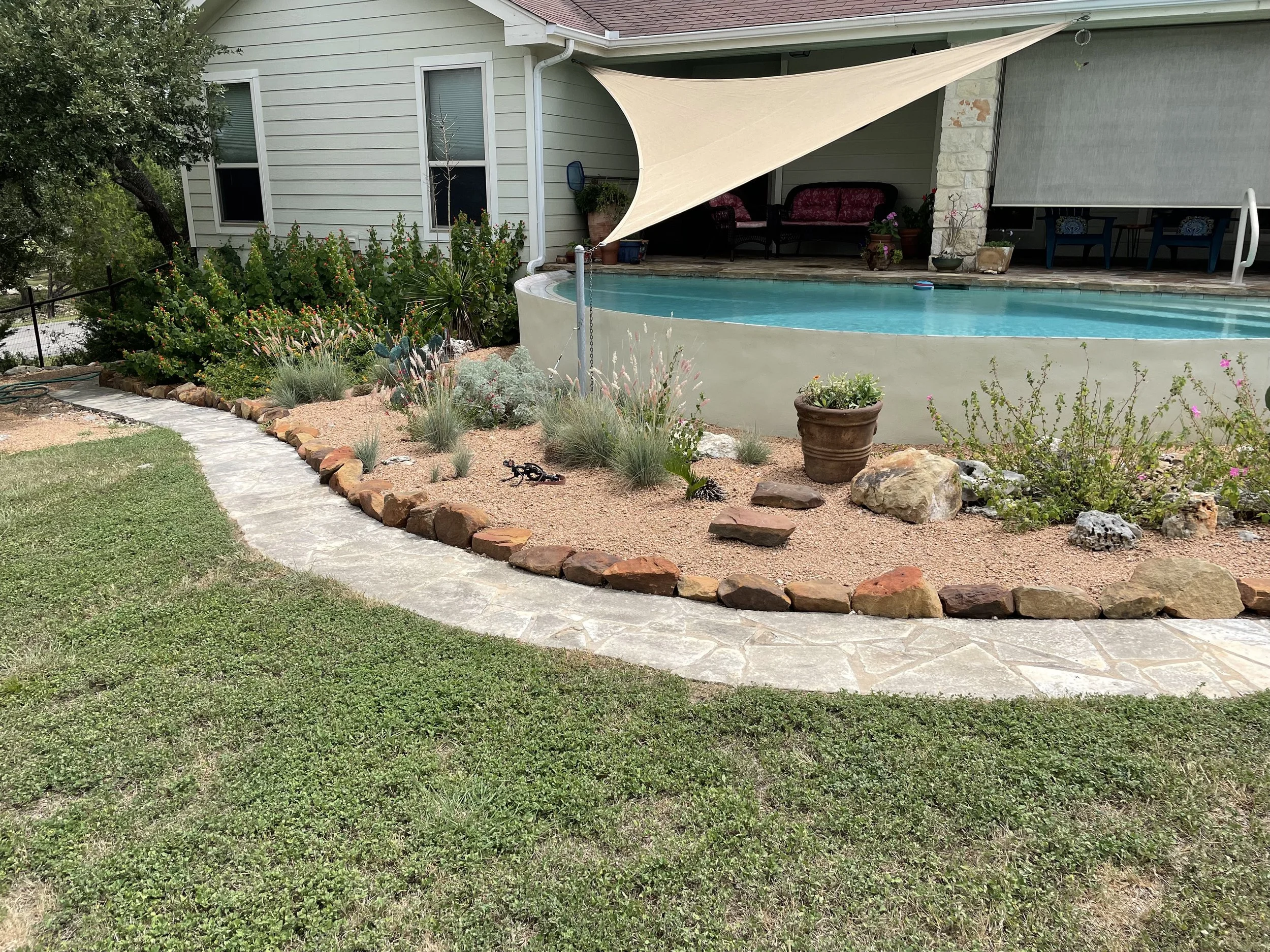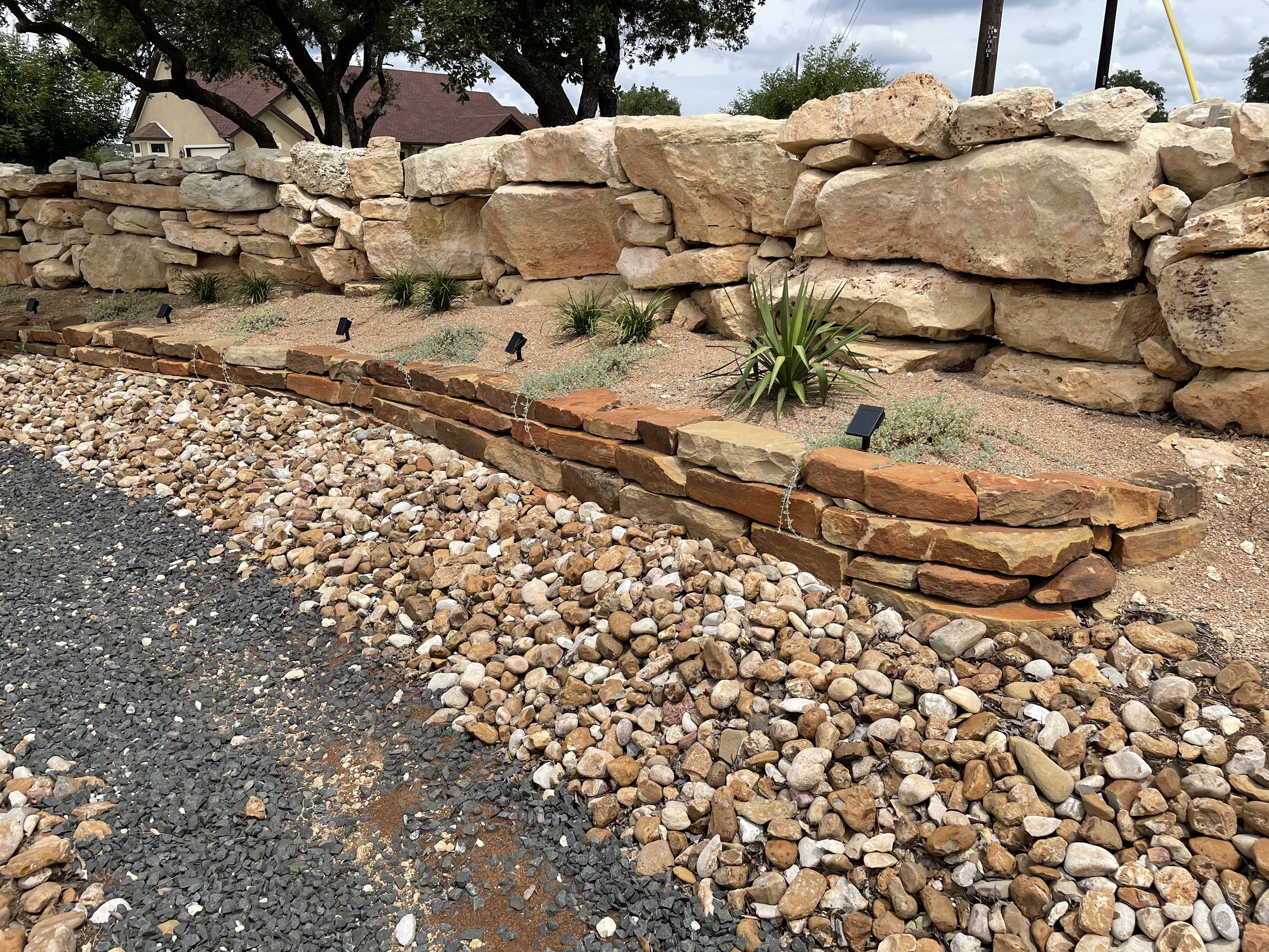 Raised bed with moss rock edging and river rock covered beds