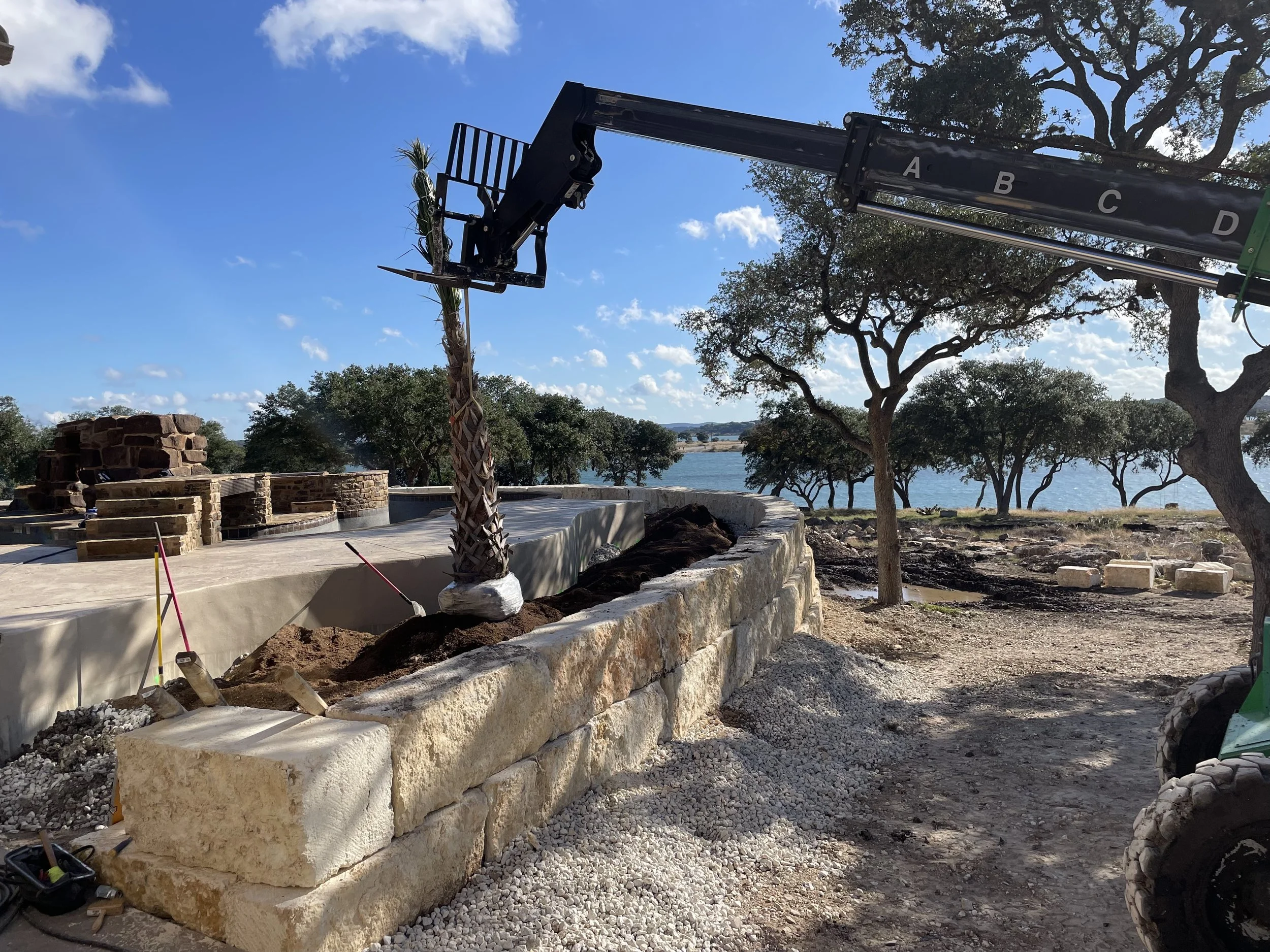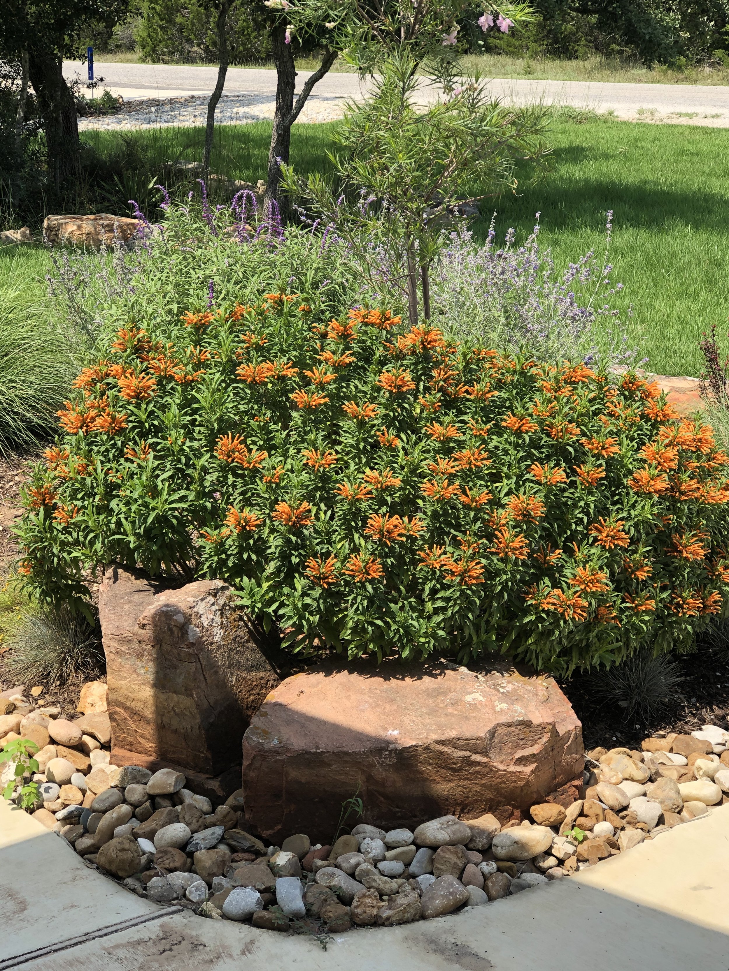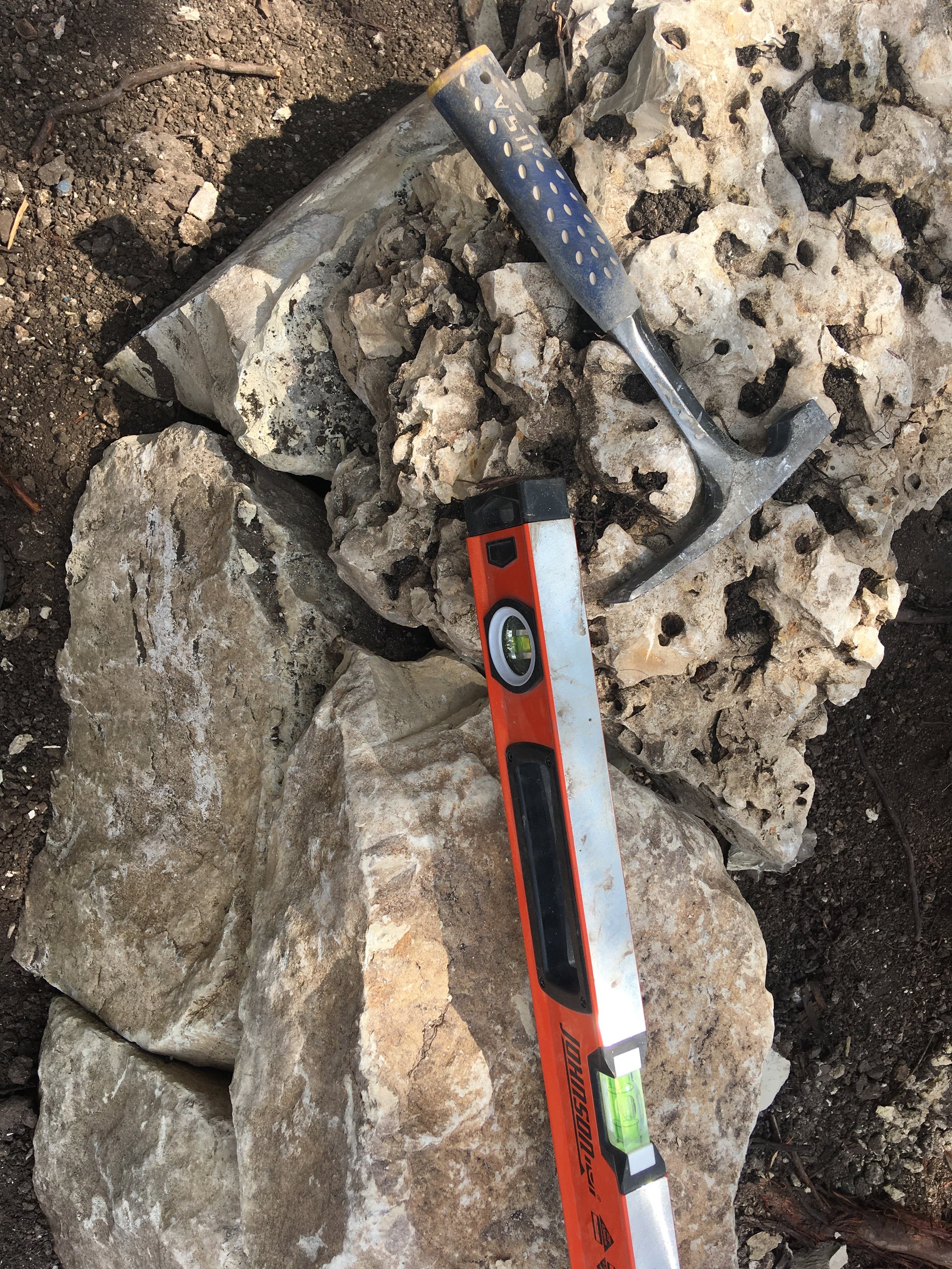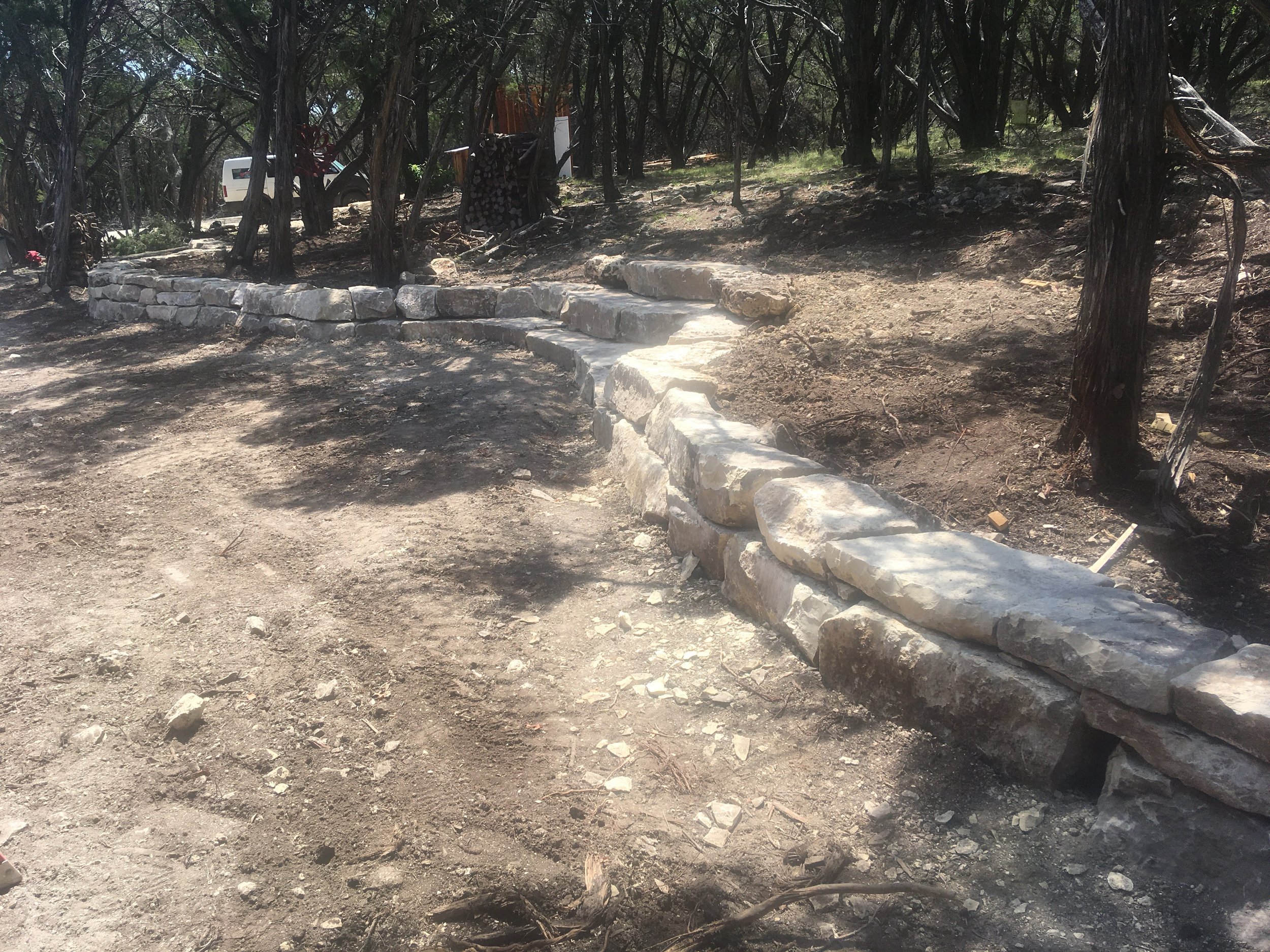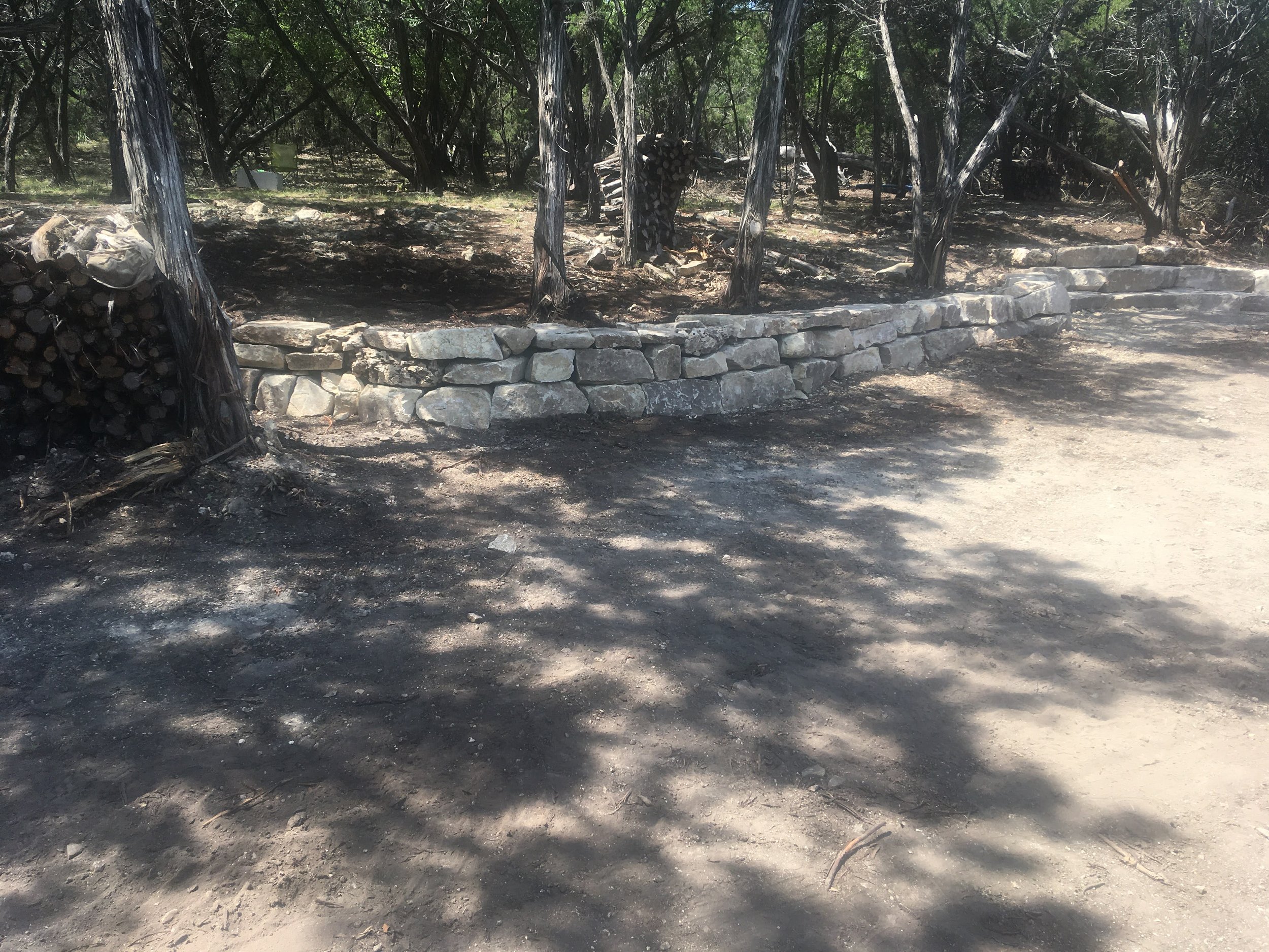 Raised bed with moss rock edging and river rock covered beds