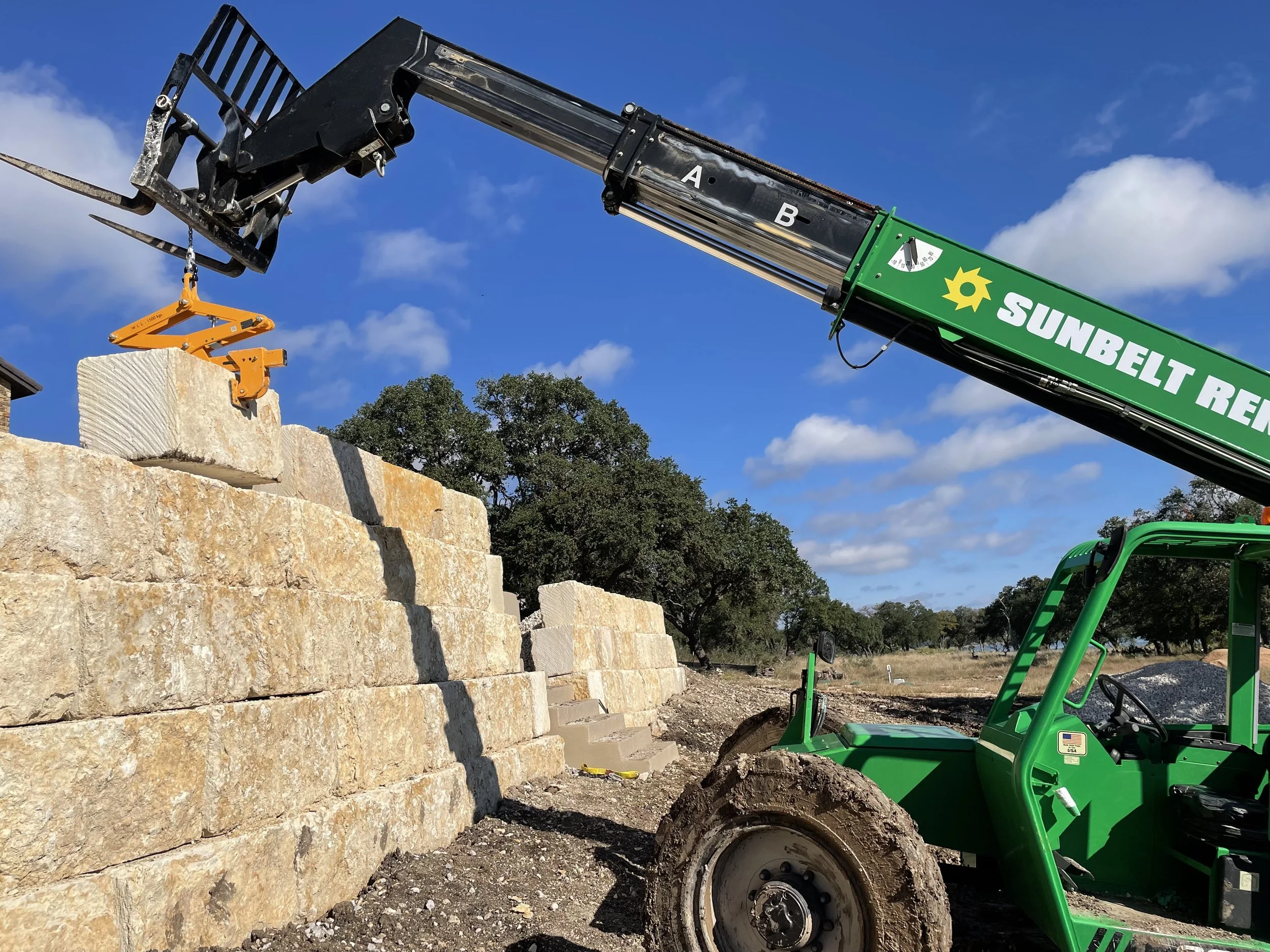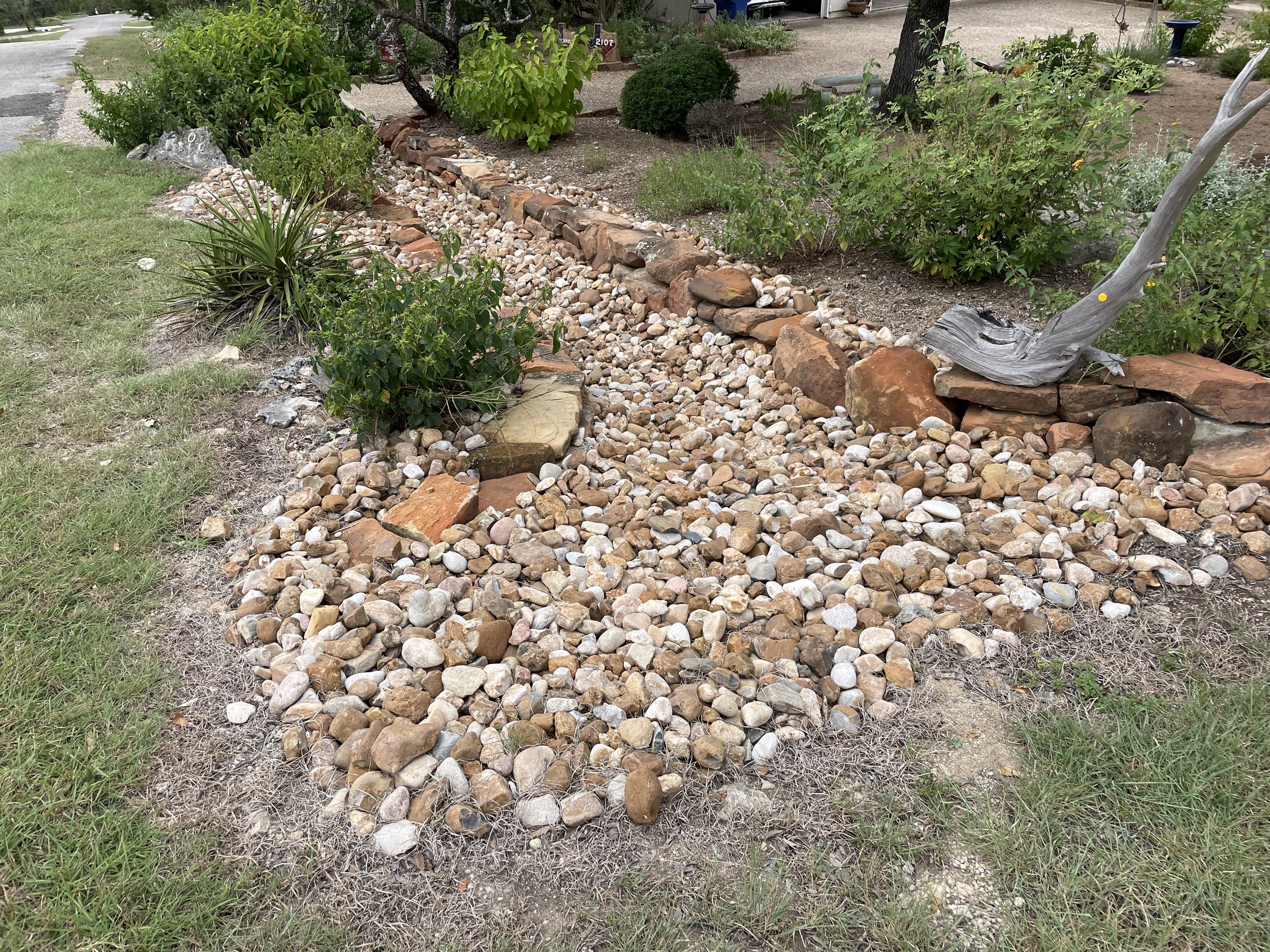 River rock dry creek with moss rock retaining wall, raised planting beds & drought tolerant Zoysia Grass lawn installation.